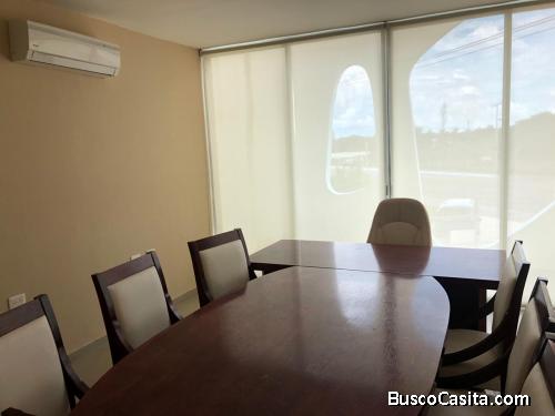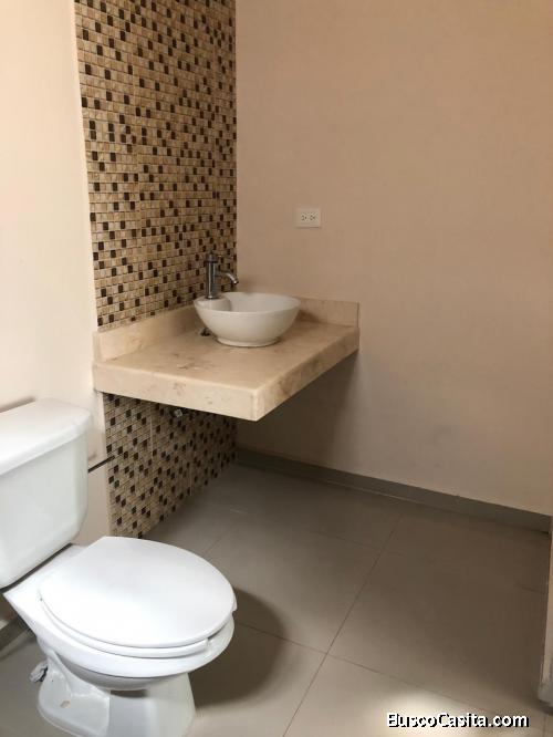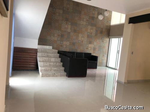 Cuenta con: Sala, Techos doble altura, Comedor, Cocina vestida con gabinetes, 3 habitaciones, mesetas de granito, 3 baños, aire acondicionado en todas las habitaciones, Cochera hasta para 5 vehículos y Jardín